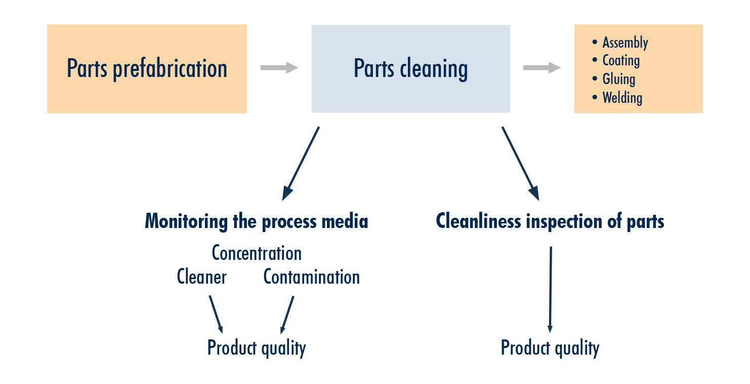 Benchmark for the quality level of a cleaning process is the reliable achievement of the required parts cleanliness. This requires quality-assuring process management by monitoring and controlling the cleaning process and the relevant process parameters.